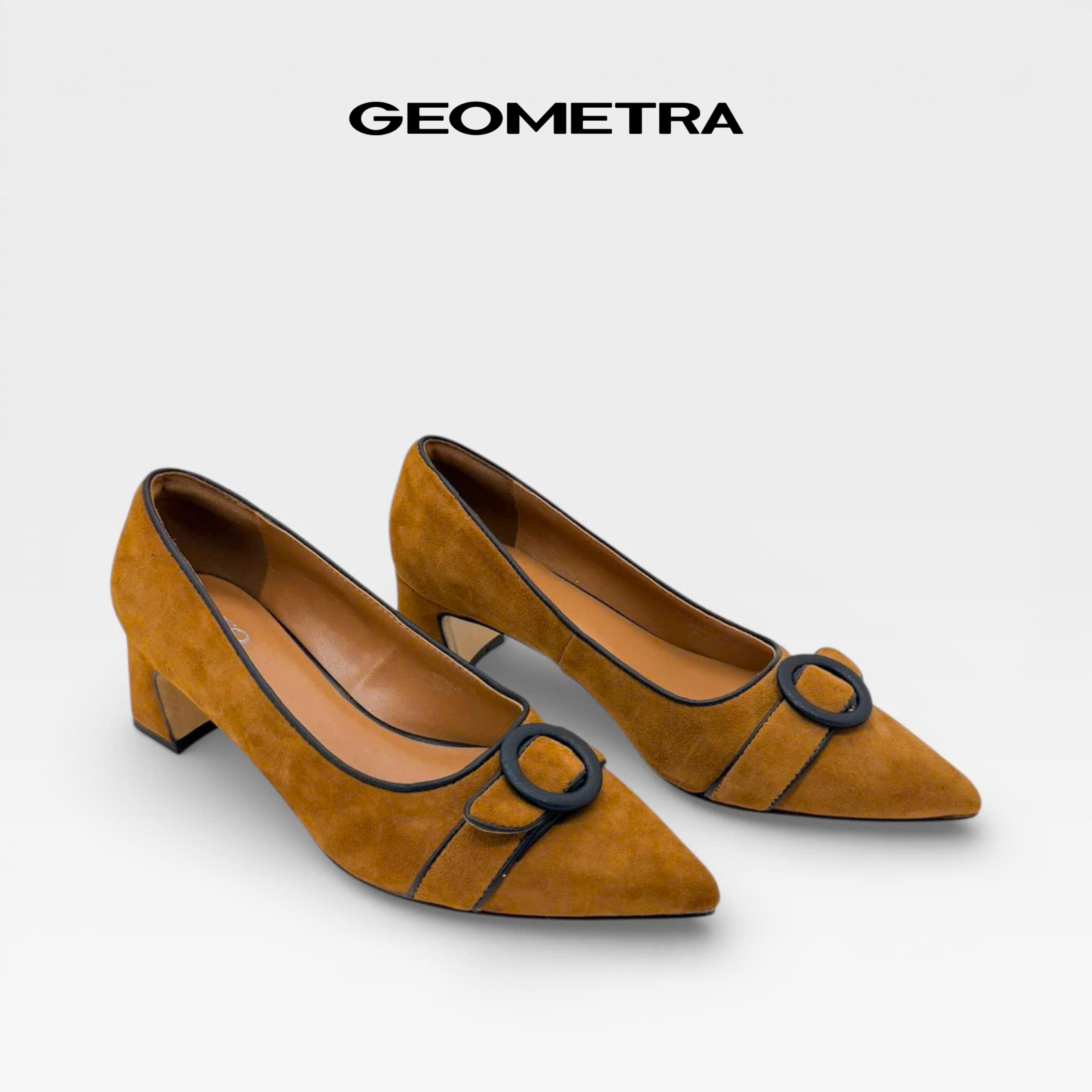 Giày Bít Mũi Nhọn gót vuông SunPetal GEOMETRA WMN0225 - Giày cao gót công sở da bò lộn cao cấp - NÂU BÒ